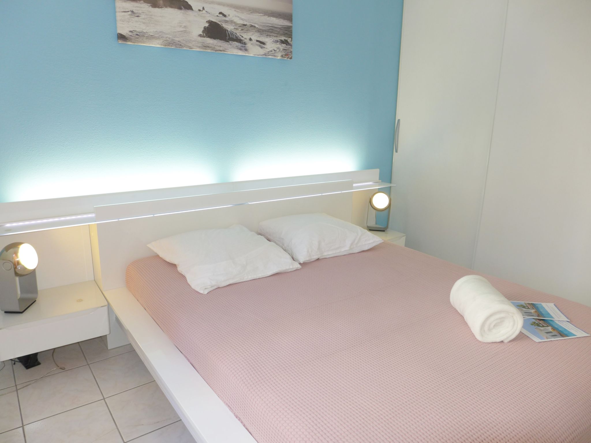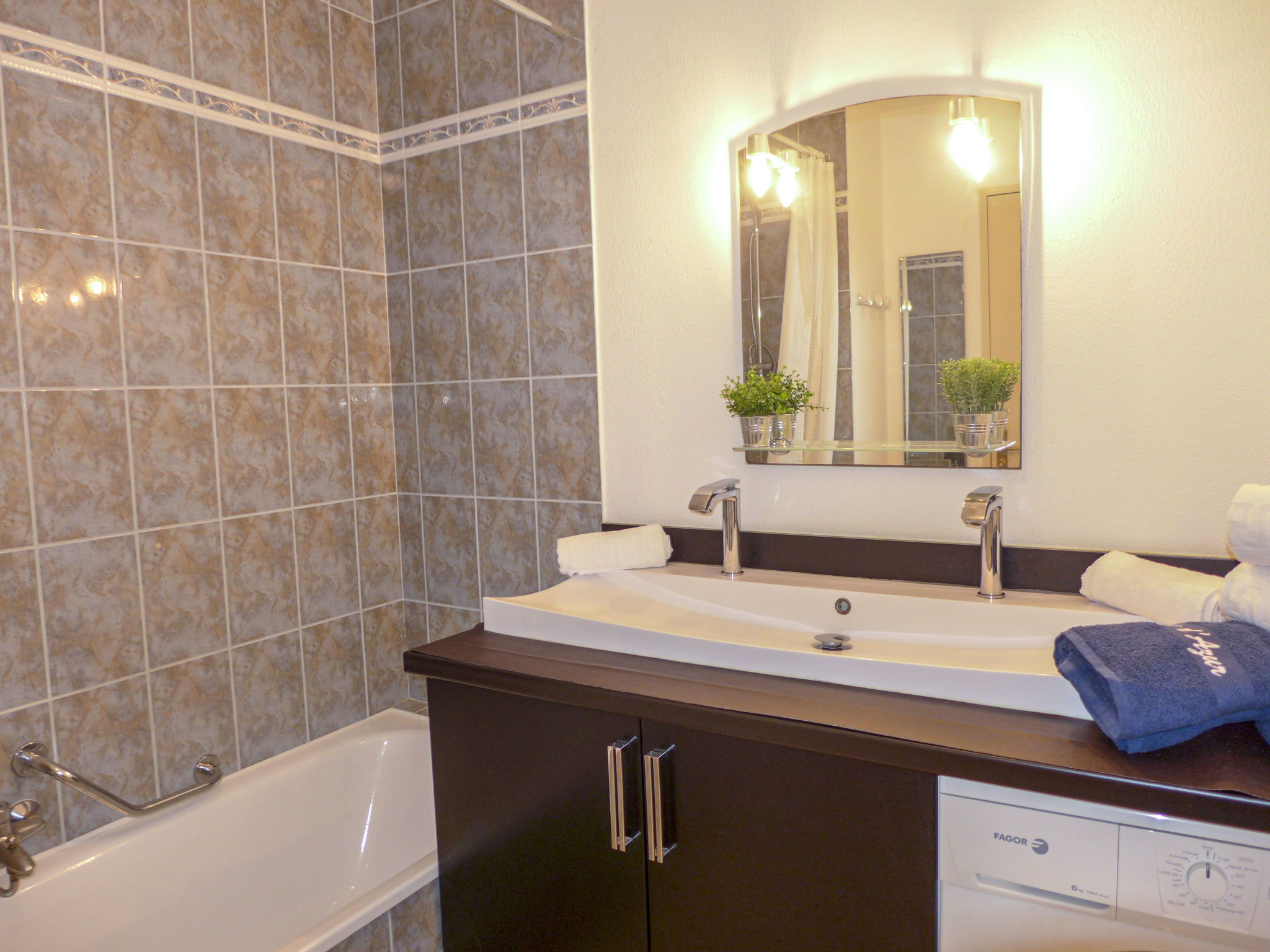 Appartement de 3 pièces 72 m2, rez-de-chaussée surélevé. Aménagement confortable et moderne: séjour/salle à manger avec baie vitrée avec 1 divan-lit double (1 x 140 cm, longueur 190 cm), TV, écran plat et air-conditionné. Sortie sur la terrasse. 2 chambres, chaque chambre avec: 1 grand-lit (1 x 160 cm, longueur 200 cm). Cuisine (3 plaques de cuisson, four, lave-vaisselle, grille-pain, bouilloire électrique, micro-ondes, congélateur, cafetière électrique). Salle de bains, WC séparé. Chauffage électrique. Terrasse 20 m2. Meubles de terrasse, chaises longues (2). A disposition: lave-linge, fer à repasser. Internet (Connexion WIFI, en sus). Garage No 41, hauteur 200 cm. Veuillez noter: adapté(e) aux familles logement côté rue. TV seulement FR. Détecteur de fumée. FJS1061HT