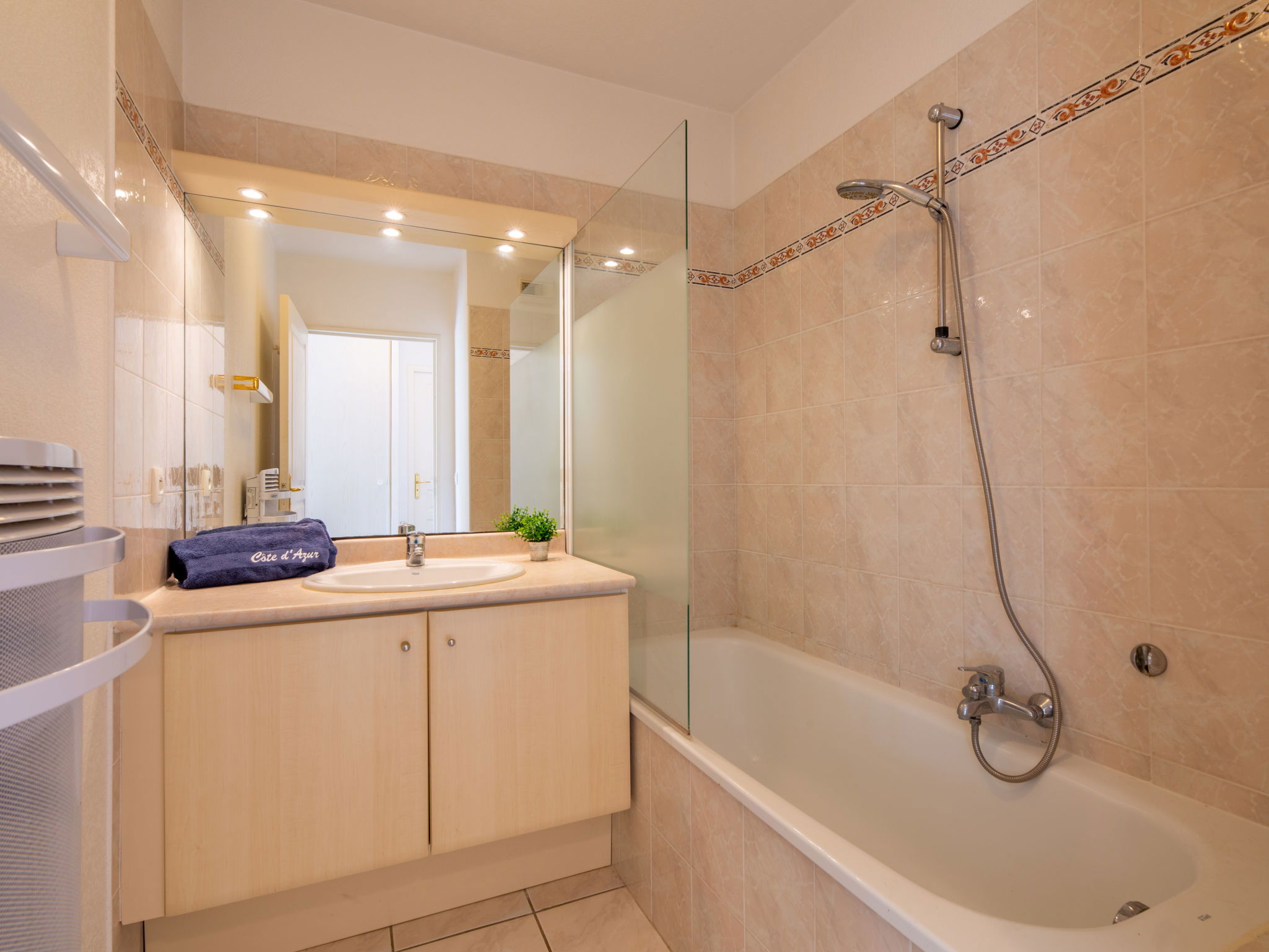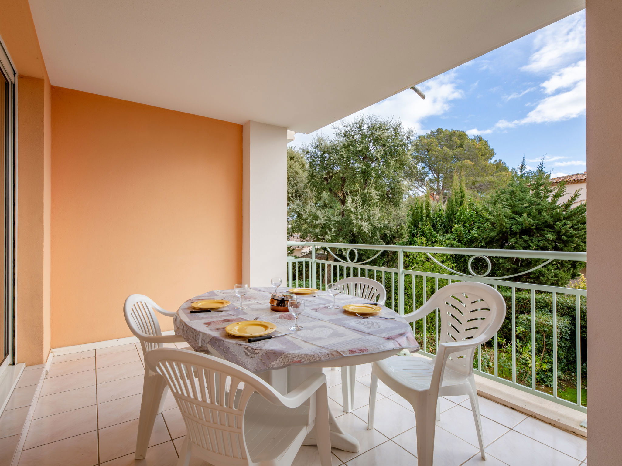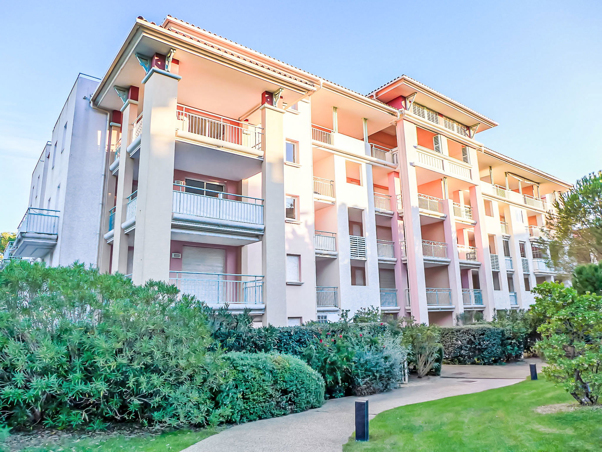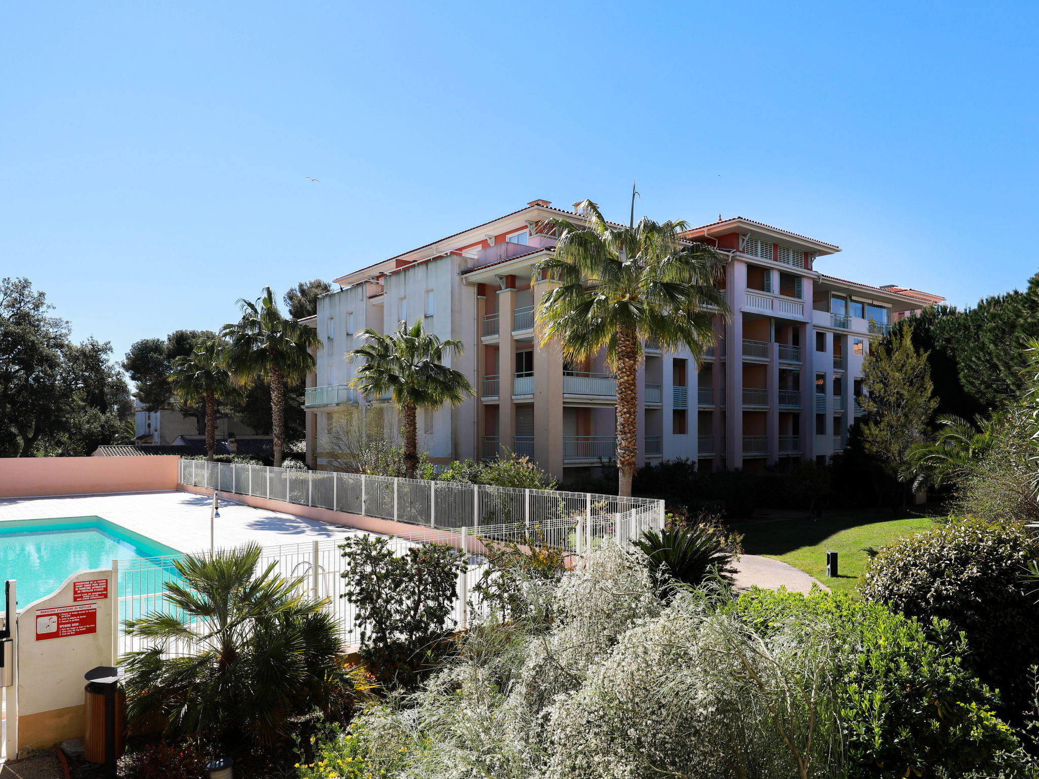 Belle résidence moderne "Les Calanques du Parc", de 4 étages, année de construction 2003, environnée par les arbres. Dans la localité, à 200 m du centre, dans un quartier résidentiel, à 300 m de la mer, à 300 m de la plage. En commun: parc (clôturé), piscine rectangulaire cloturée (disponibilité saisonnière: 15.Mai. - 28.Sep. horaires d'ouverture de la piscine: 09:00-20:00). Bassin pour les enfants. Infrastructures de la résidence: ascenseur. Place de parking (couvert). Magasins 350 m, centre commercial 5 km, centre à 5 minutes à pieds, arrêt de bus "Grand Parc" 260 m, gare ferroviaire "Fréjus" 6 km, plage de sable 500 m, parc "Areca" 100 m, centre de plongée 6 km, centre thermal "Thalasso de Port Fréjus" 6 km. Port plaisance 500 m, terrain de golf (18 trous) 8 km, ecole de voile 7 m, centre équestre 1 km, centre sportif 500 m. Attractions à proximité: Lunapark, Aqualand 5 km, Fréjus 6 km, Saint Raphaël 8 km, St Tropez 30 km, Cannes 47 km, Nice 71 km. Les domaines skiables de renommée sont facilement accessibles: Auron, Isola 2000 150 km. Les lacs connus sont facilement accessibles: Lac de St Cassien 45 km, Lac du Du Verdon 90 km. Région de randonnées: Estérel 16 km, Sentier du Littoral 300 m. La remise des clés a lieu à l’agence de Saint Aygulf.