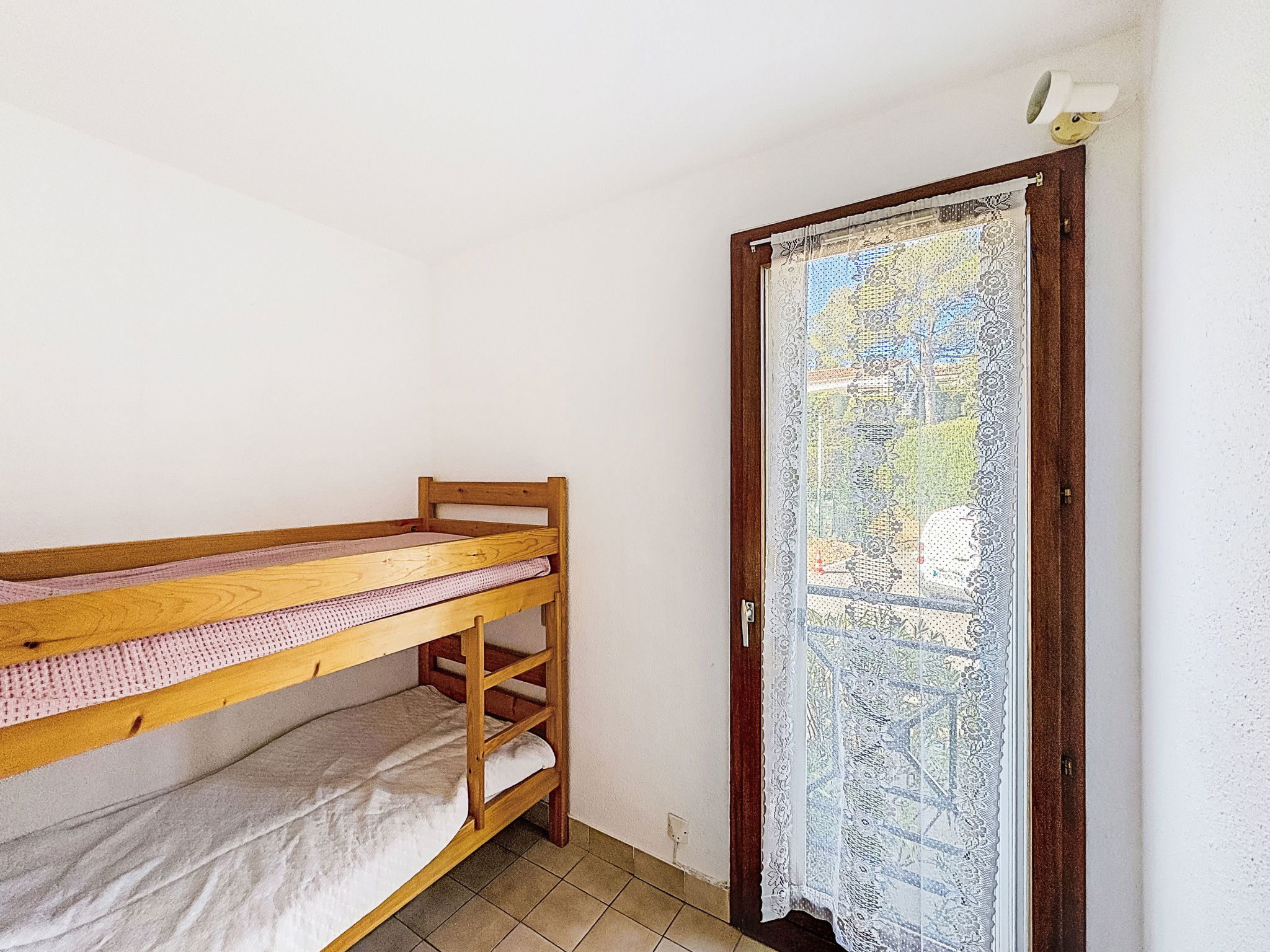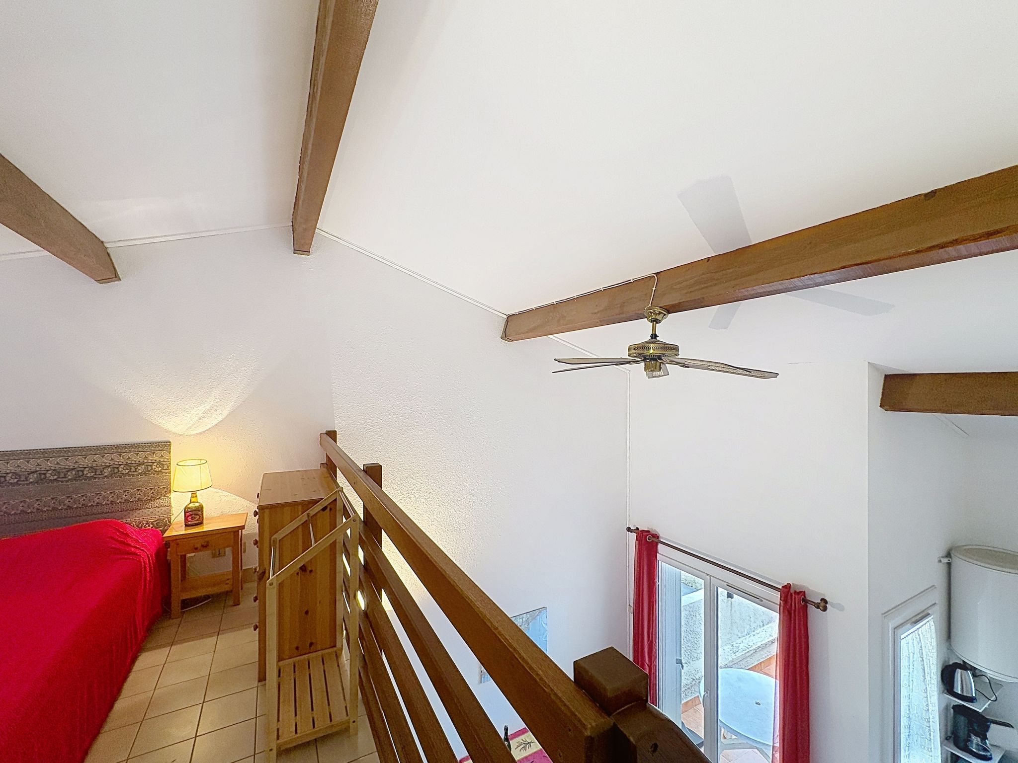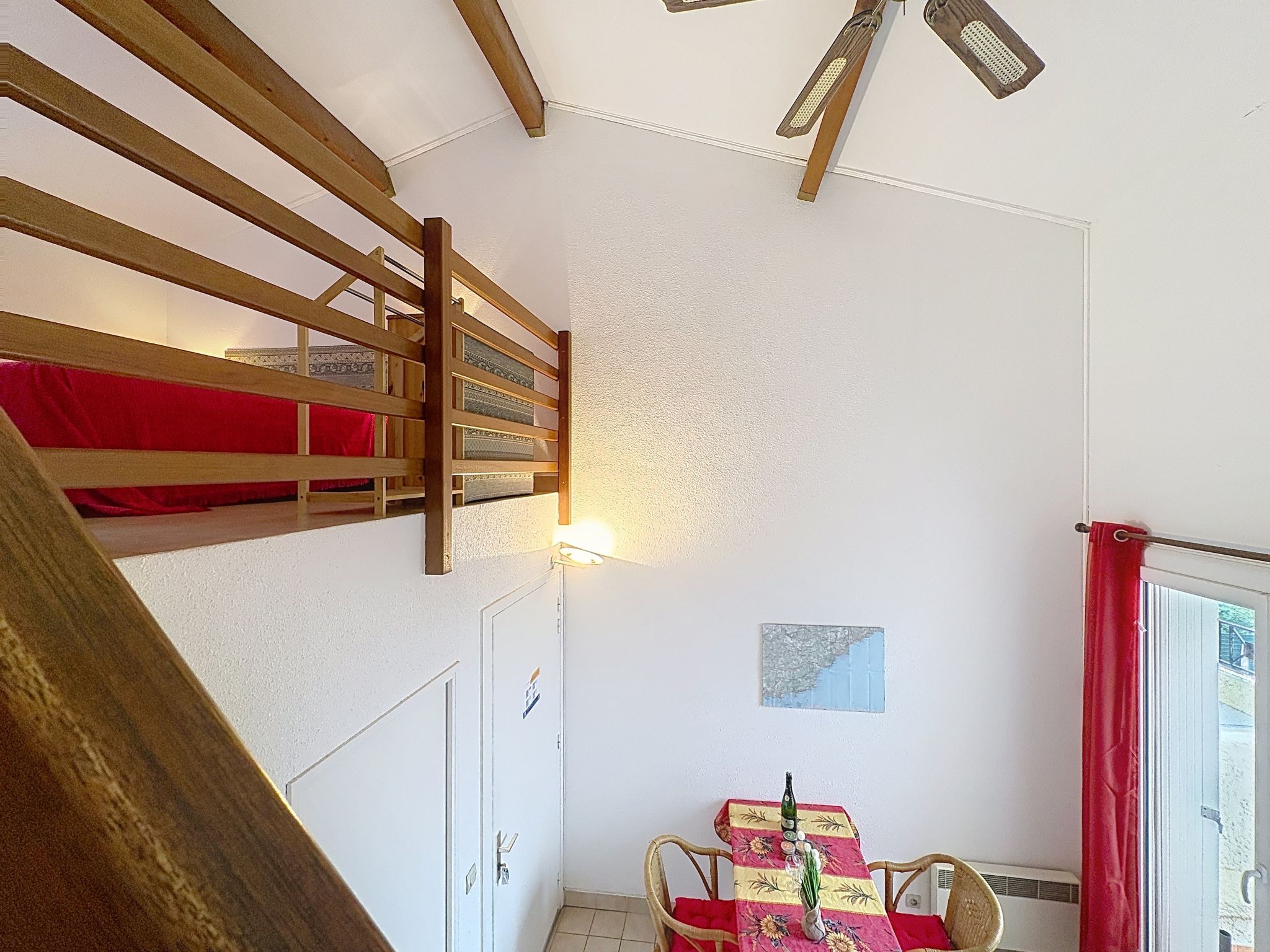 Appartement de 2 pièces 32 m2 au 1er étage. Aménagement simple: séjour/salle à manger avec TV (écran plat). Sortie sur la terrasse. 1 petite chambre avec 1 x 1 lits superposés (80 cm, longueur 190 cm). Galerie avec 1 grand-lit (1 x 140 cm, longueur 190 cm), ventilateur. Coin cuisine (4 plaques de cuisson, four, grille-pain, bouilloire électrique, cafetière électrique). Sortie sur la terrasse. Douche/WC. Chauffage électrique. Terrasse 8 m2. Meubles de terrasse. Vue sur la mer. A disposition: lave-linge, fer à repasser. Internet (Connexion WIFI, en sus). Place de parking (1 Voiture). Veuillez noter: TV seulement FR. Détecteur de fumée. Annonce d'un particulier (art 155, IV du CGI).