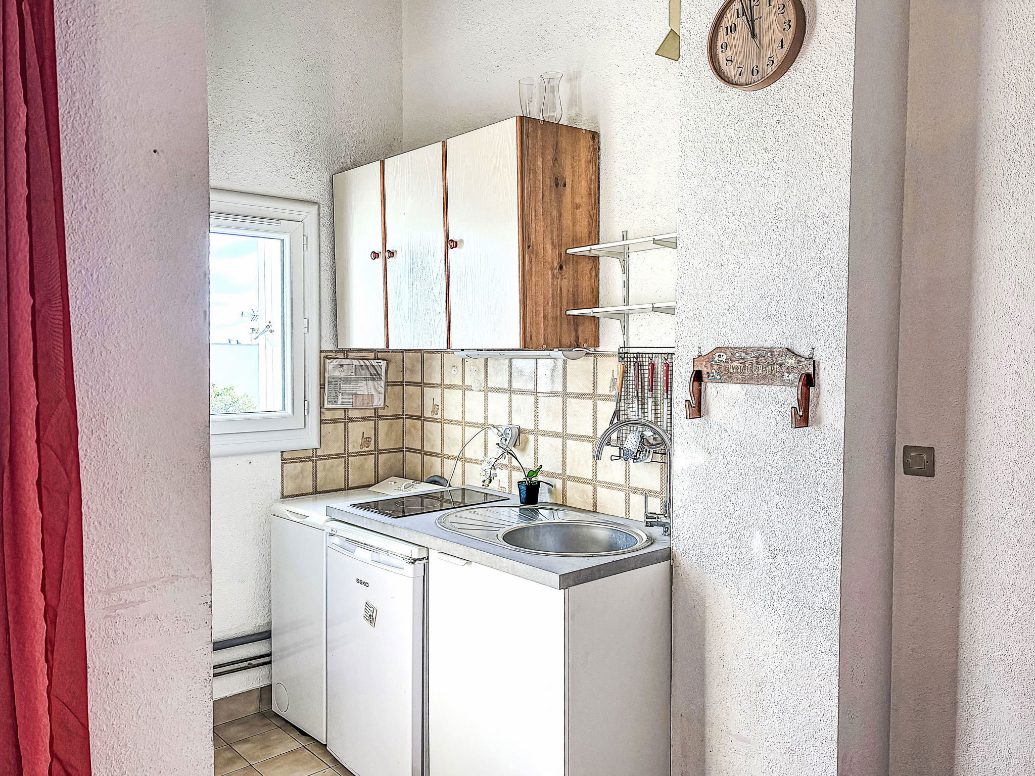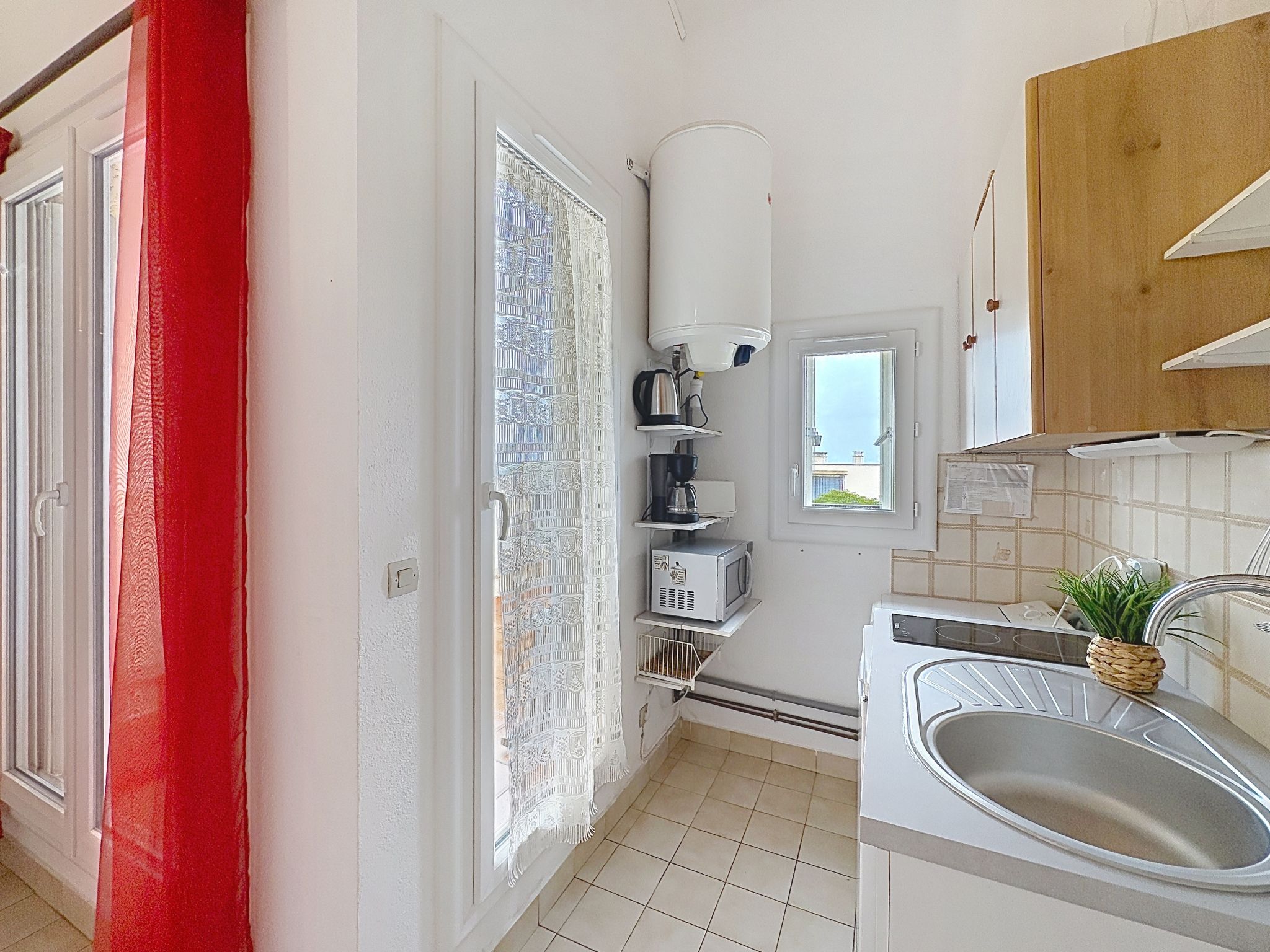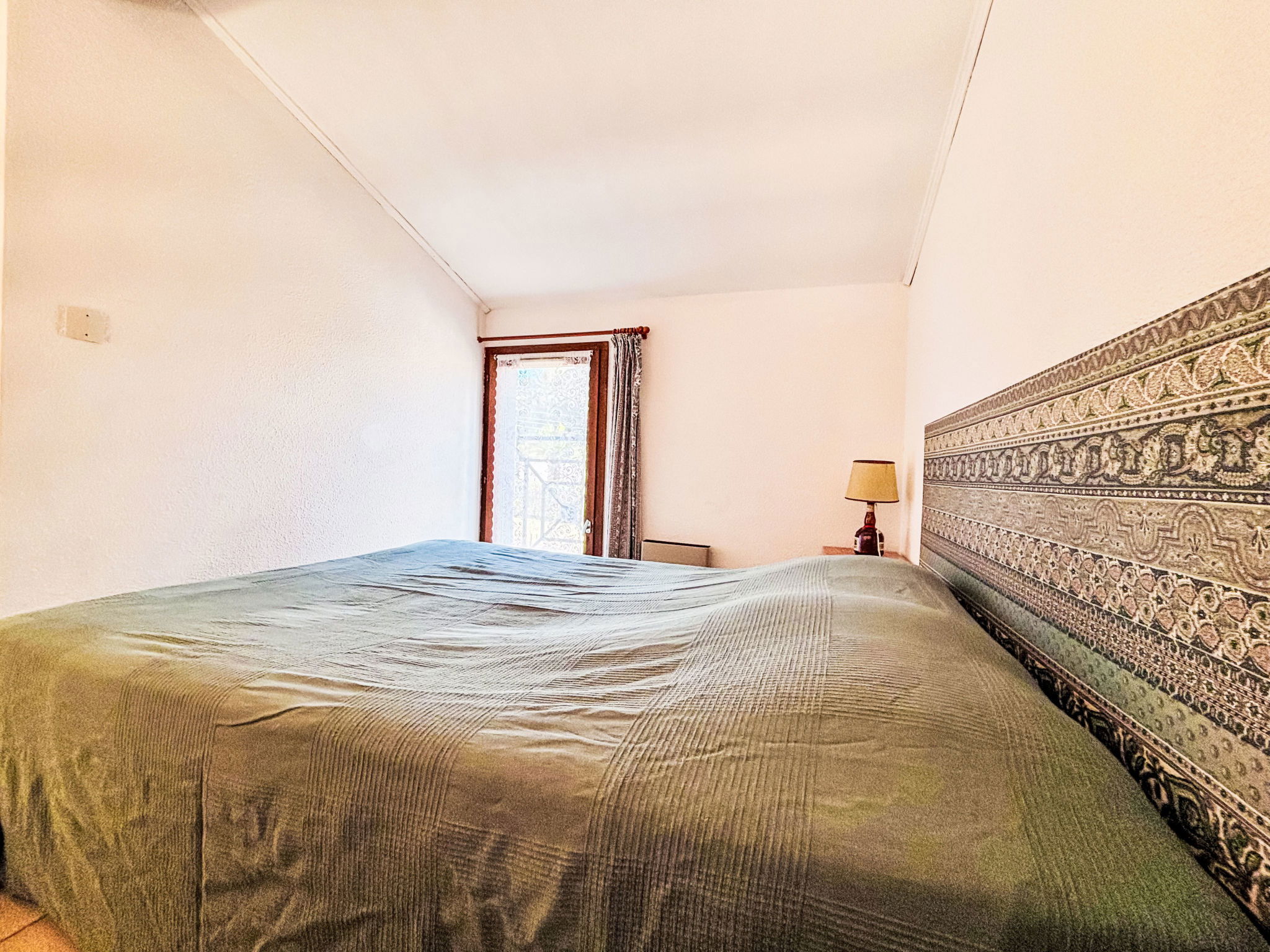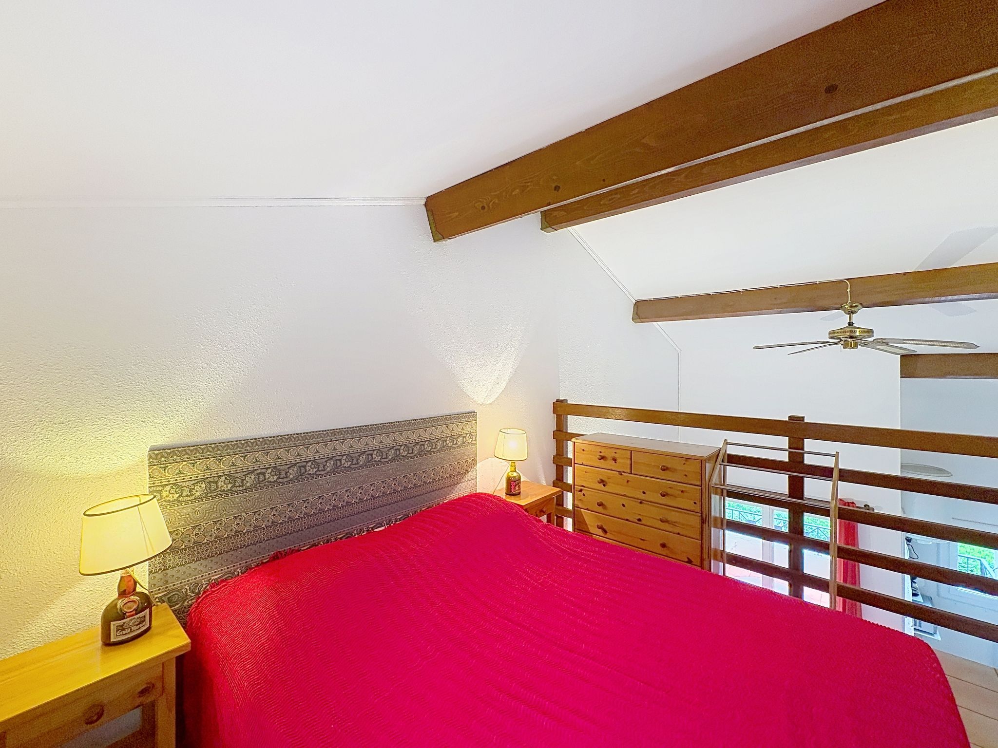 Appartement de 2 pièces 32 m2 au 1er étage. Aménagement simple: séjour/salle à manger avec TV (écran plat). Sortie sur la terrasse. 1 petite chambre avec 1 x 1 lits superposés (80 cm, longueur 190 cm). Galerie avec 1 grand-lit (1 x 140 cm, longueur 190 cm), ventilateur. Coin cuisine (4 plaques de cuisson, four, grille-pain, bouilloire électrique, cafetière électrique). Sortie sur la terrasse. Douche/WC. Chauffage électrique. Terrasse 8 m2. Meubles de terrasse. Vue sur la mer. A disposition: lave-linge, fer à repasser. Internet (Connexion WIFI, en sus). Place de parking (1 Voiture). Veuillez noter: TV seulement FR. Détecteur de fumée. Annonce d'un particulier (art 155, IV du CGI).