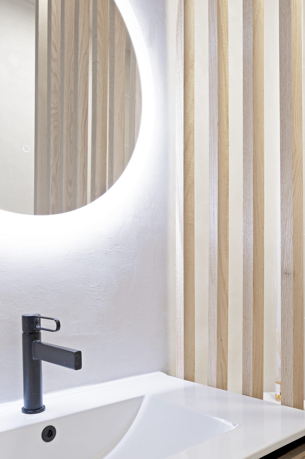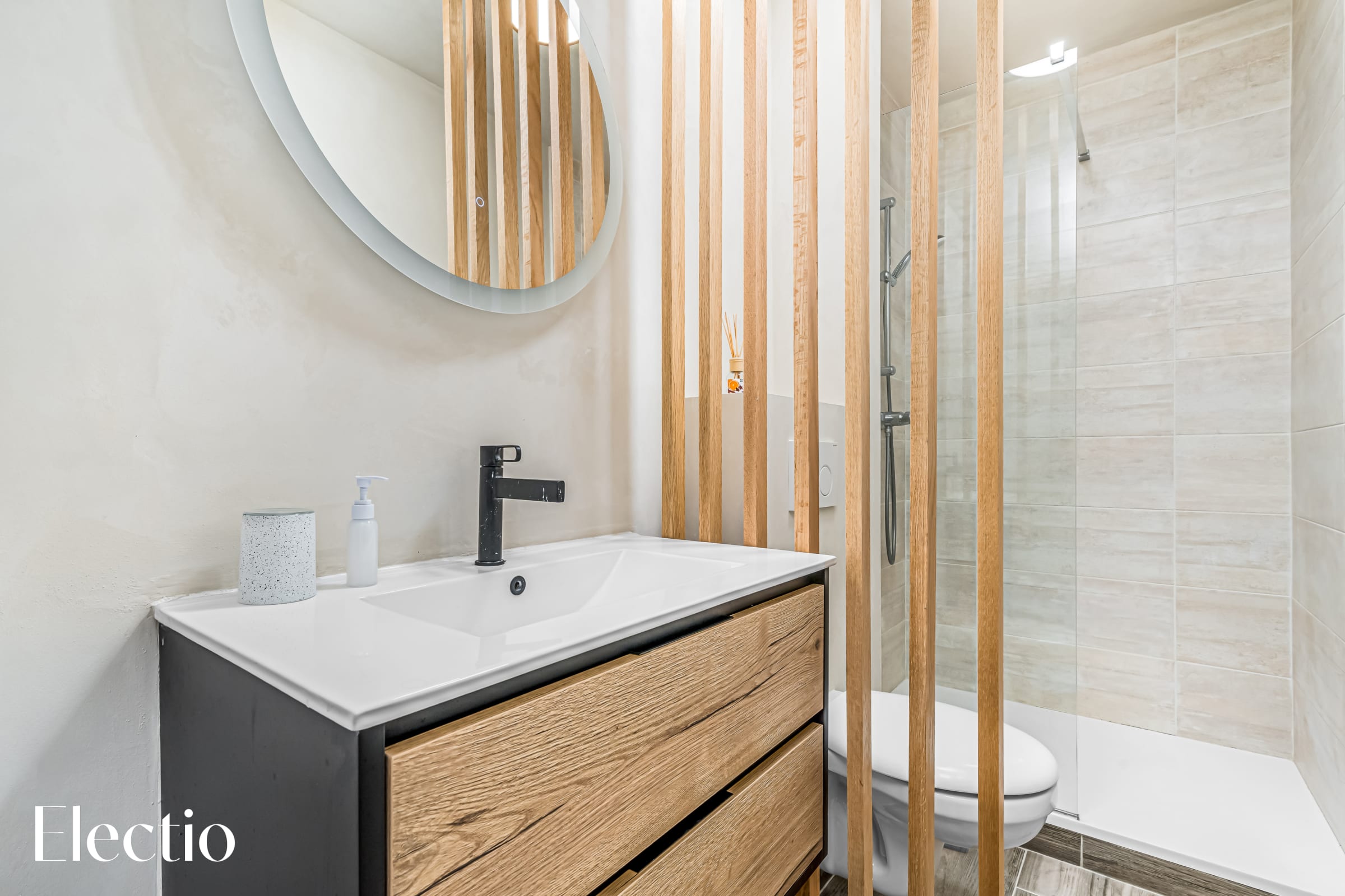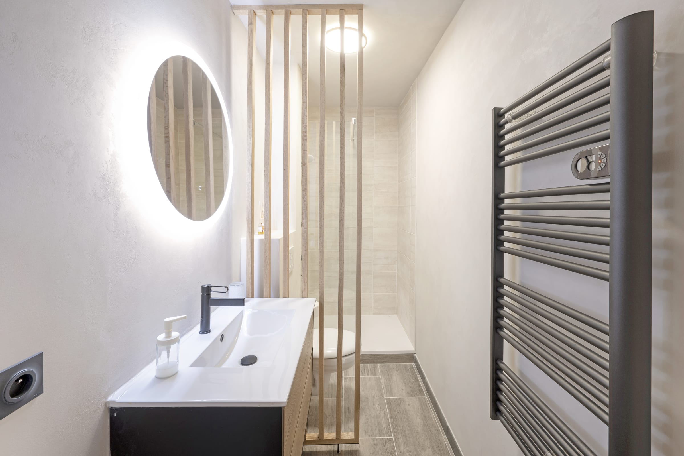 🚿 La salle d'eau, décorée avec du béton ciré et du bois, offre une touche d'élégance et de modernité. Elle comprend une douche à l'italienne, un meuble vasque avec un miroir, un sèche-serviettes, un sèche-cheveux et des toilettes.