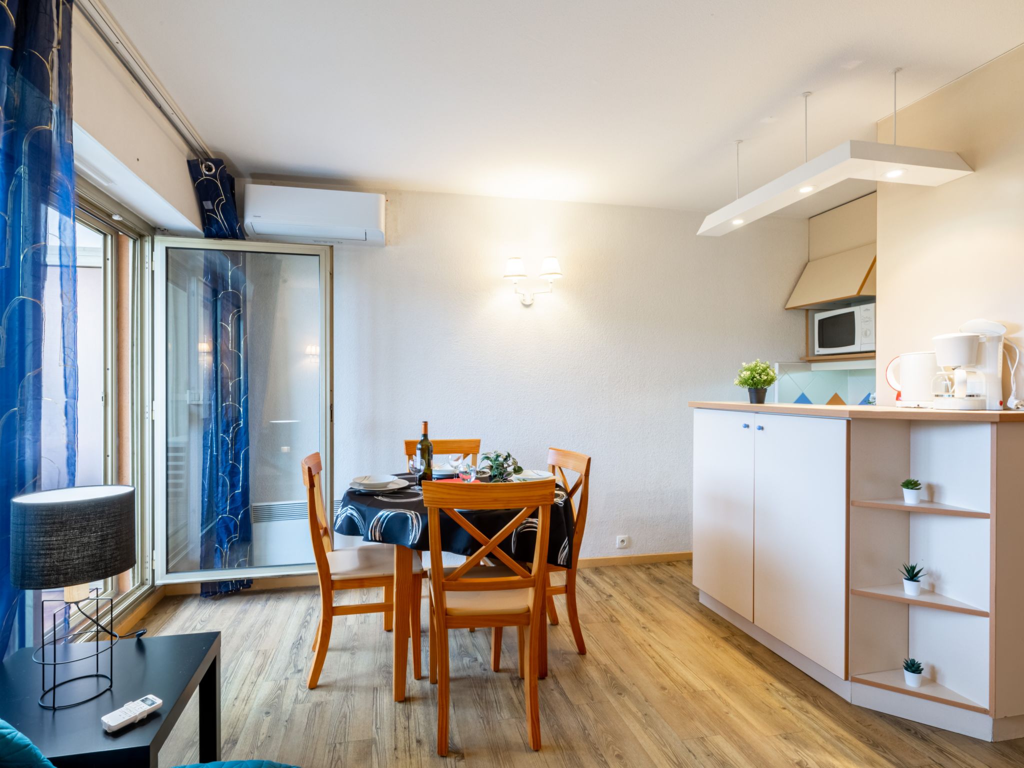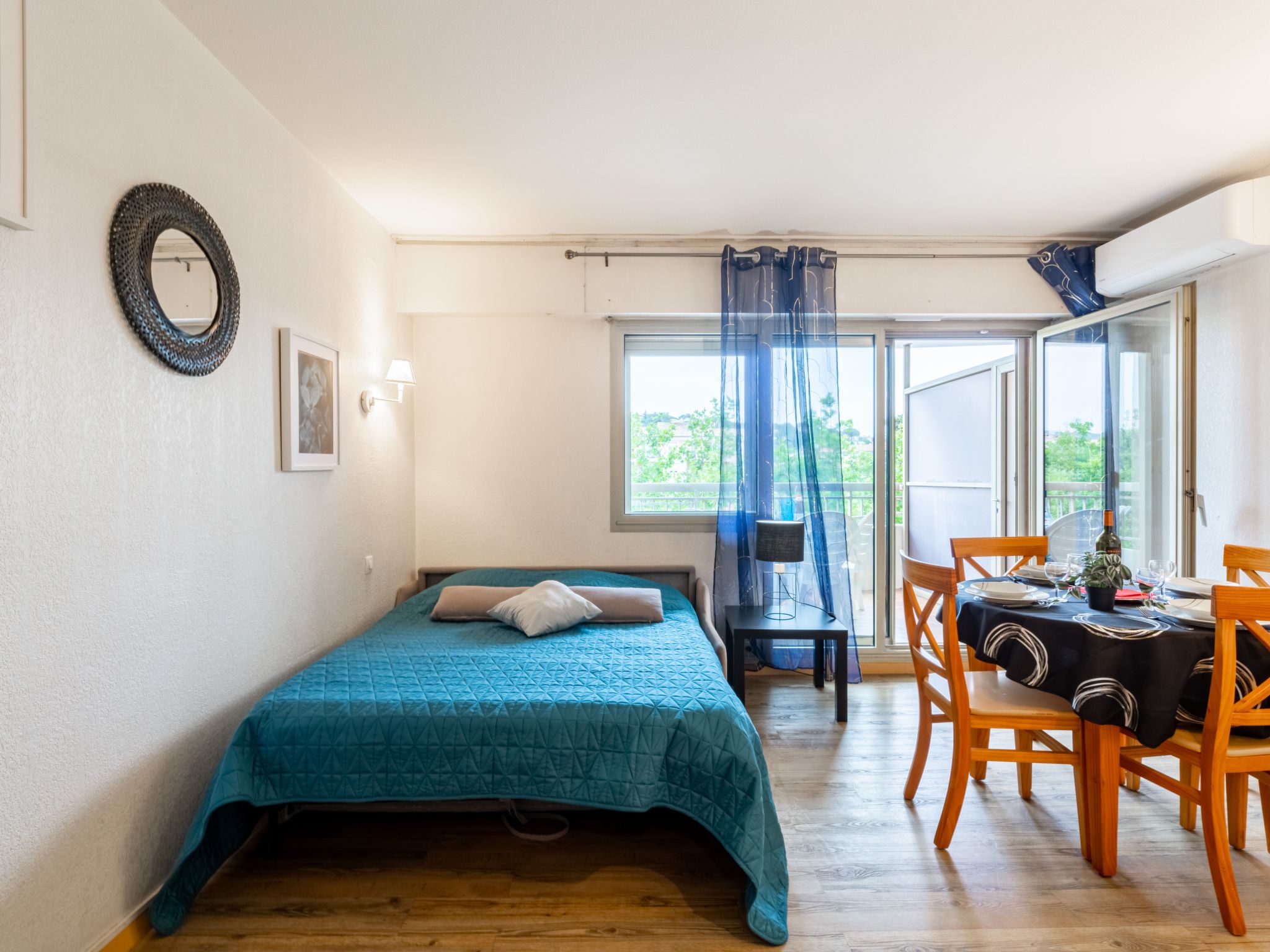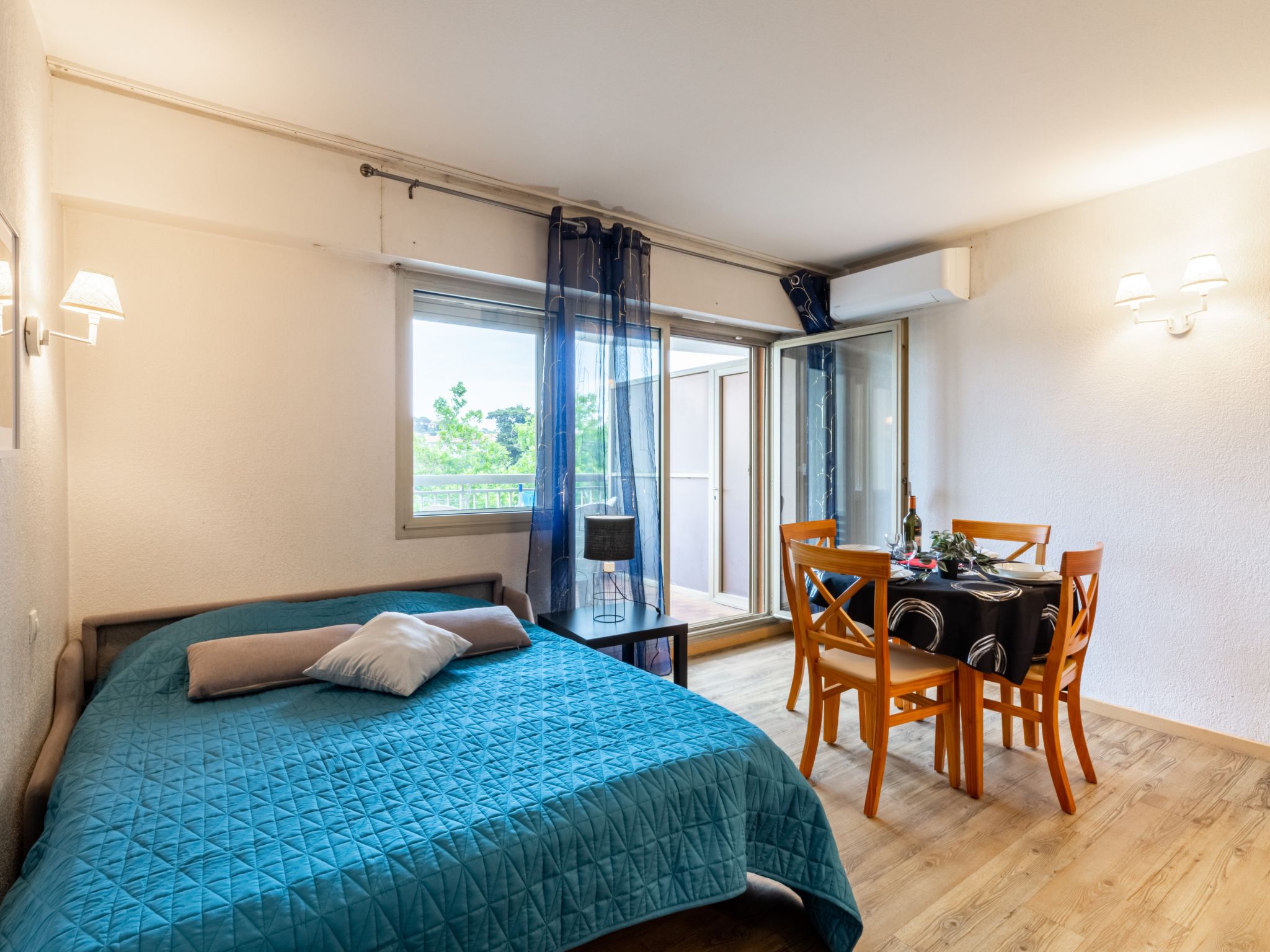 Studio 25 m2 au 3ème étage. Aménagement simple et fonctionnel: séjour/salle à manger avec 1 divan-lit double (140 cm, longueur 190 cm), TV (écran plat). Sortie sur le balcon. Entrée avec 1 x 2 lits superposés (80 cm, longueur 190 cm). Coin cuisine (2 plaques de cuisson, lave-vaisselle, bouilloire électrique, micro-ondes, cafetière électrique). Bain/WC. Chauffage, air-conditionné. Balcon 4 m2, situation est. Mobilier de balcon. Vue sur la ville. A disposition: coffre-fort. Internet (Connexion WIFI, en sus). Veuillez noter: logement côté rue. Logement non-fumeur pas de parking. 1 animal/ chien de petite taille autorisé. Détecteur de fumée. Au lieu d'une chambre fermée, des espaces de couchage sont situés dans une zone ouverte (galerie, alcôve...). 83115003001DP