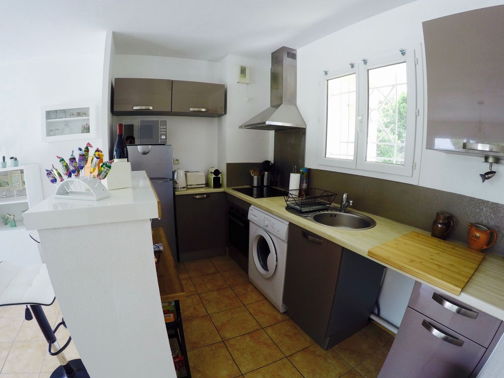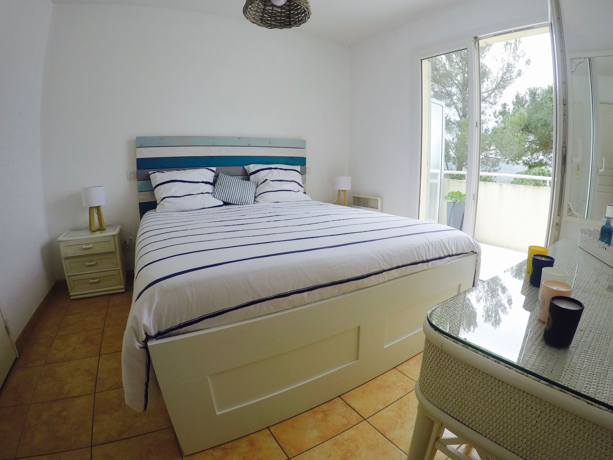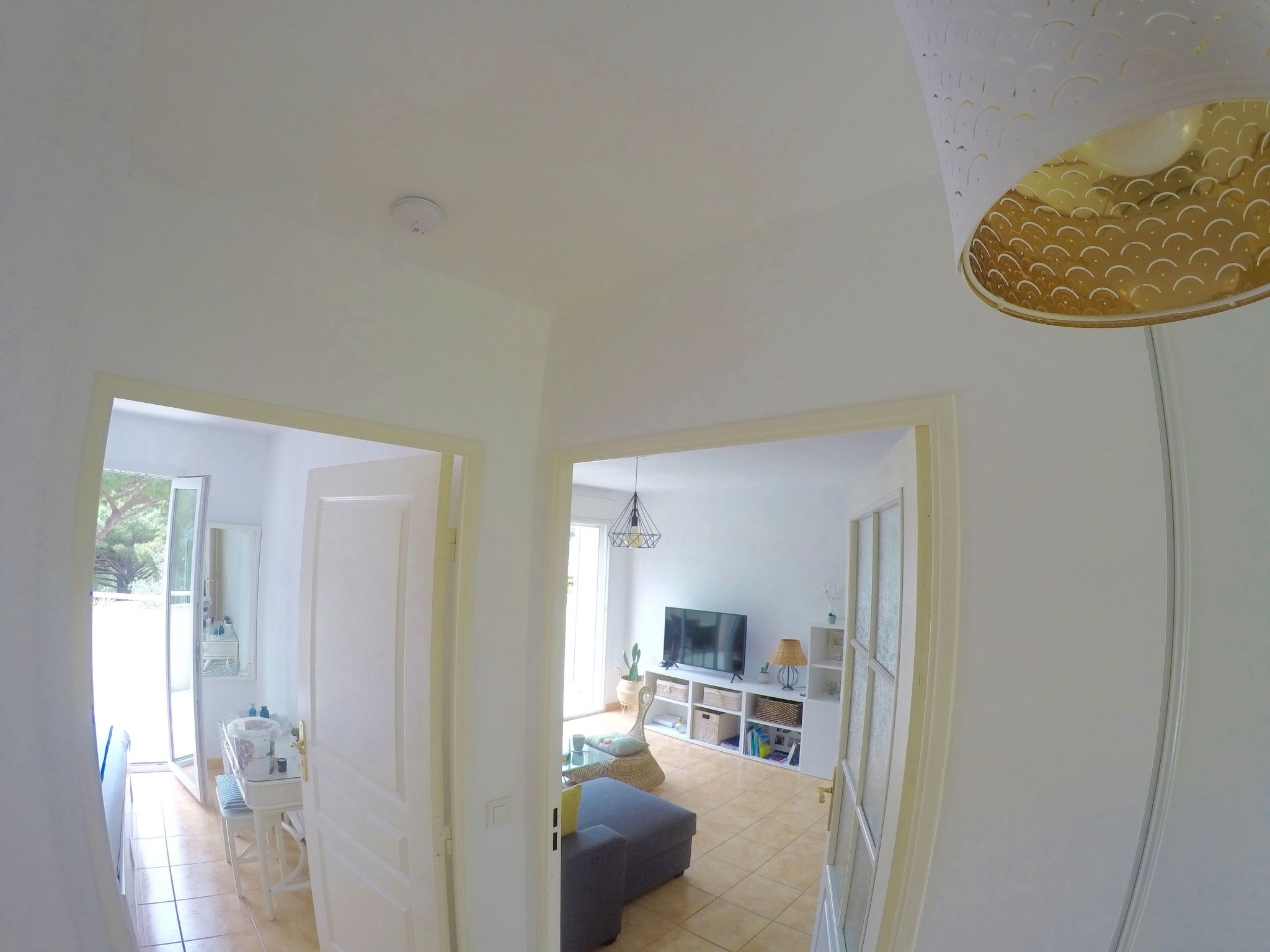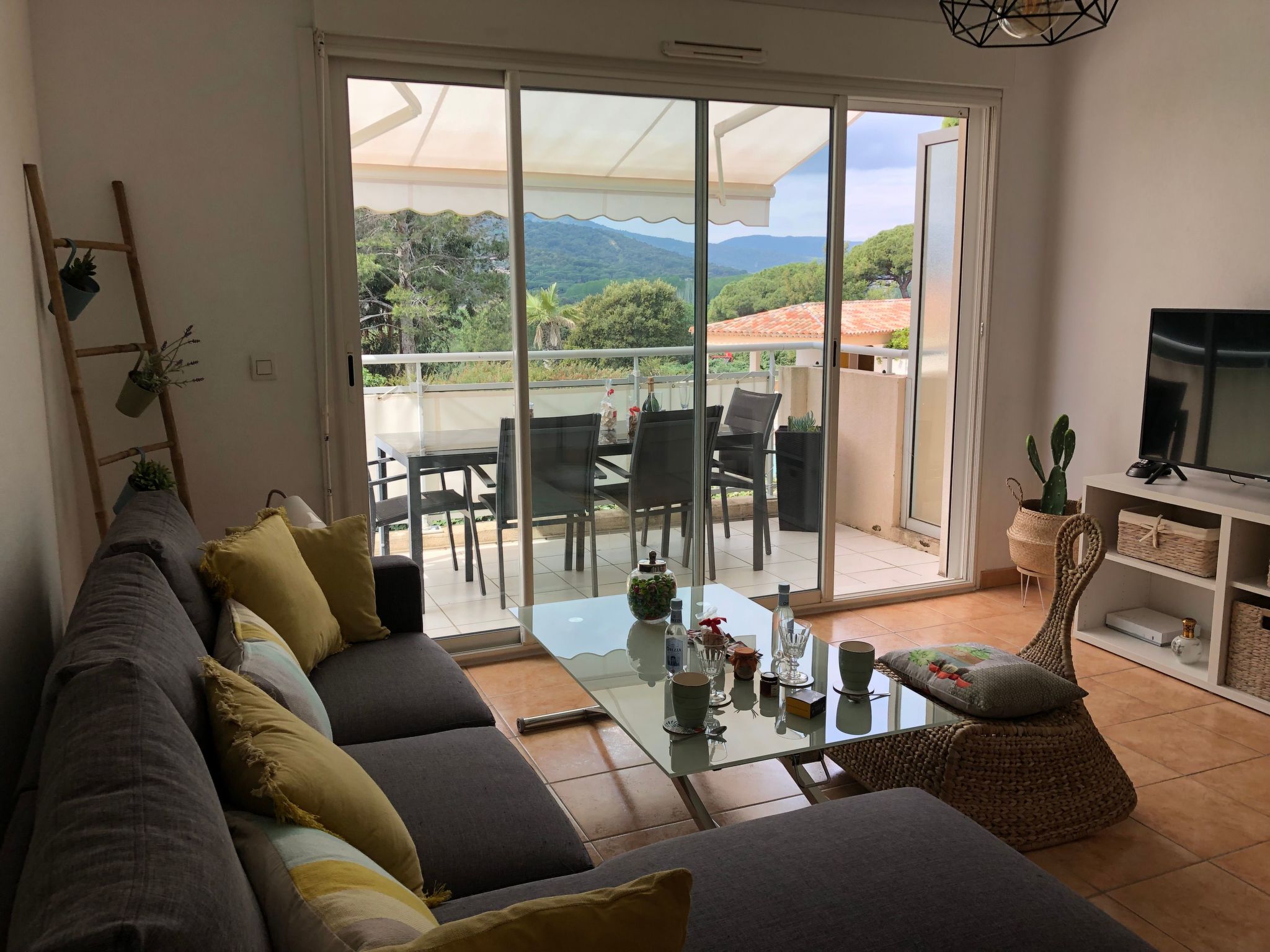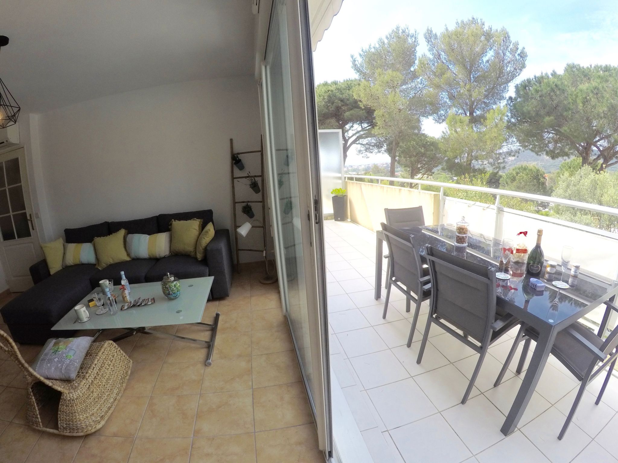 À l'extérieur, profitez d'une terrasse ensoleillée équipée de deux transats, d'un store ban pour protéger du soleil, d'une table pour prendre vos repas en plein air et d'un barbecue électrique. La résidence propose également une piscine en commun, nichée en contrebas, et une place de parking privative est disponible à proximité de l'appartement. Sans oublier la vue imprenable sur le Massif des Maures que vous pouvez admirer tout en profitant de la tranquillité des lieux.