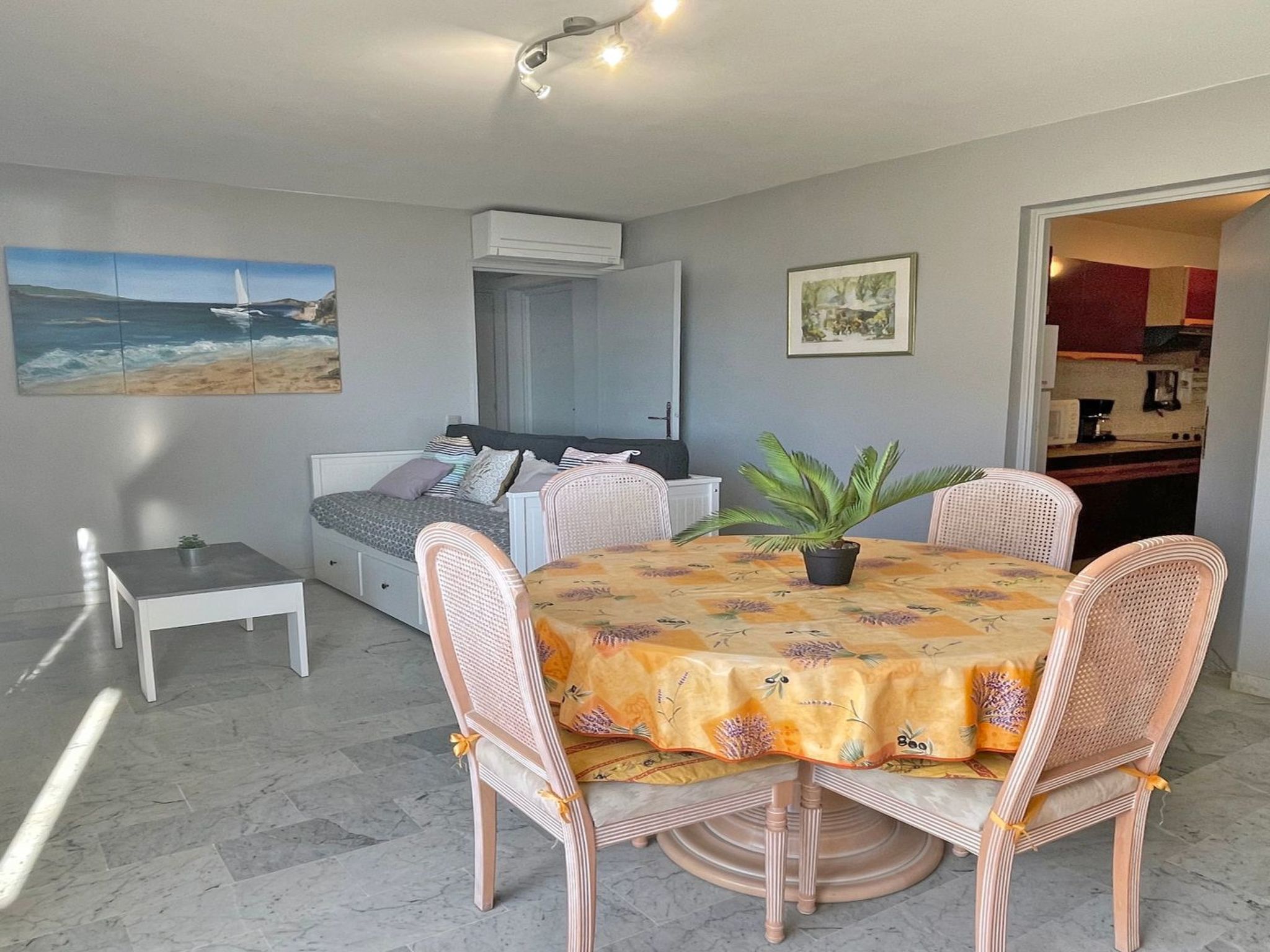 - Pièce à vivre climatisée avec canapé-lit gigogne 2x80 (ou 160), table et chaises de repas, buffet, accès balcon de 3m² avec mobilier de repas et belle vue mer