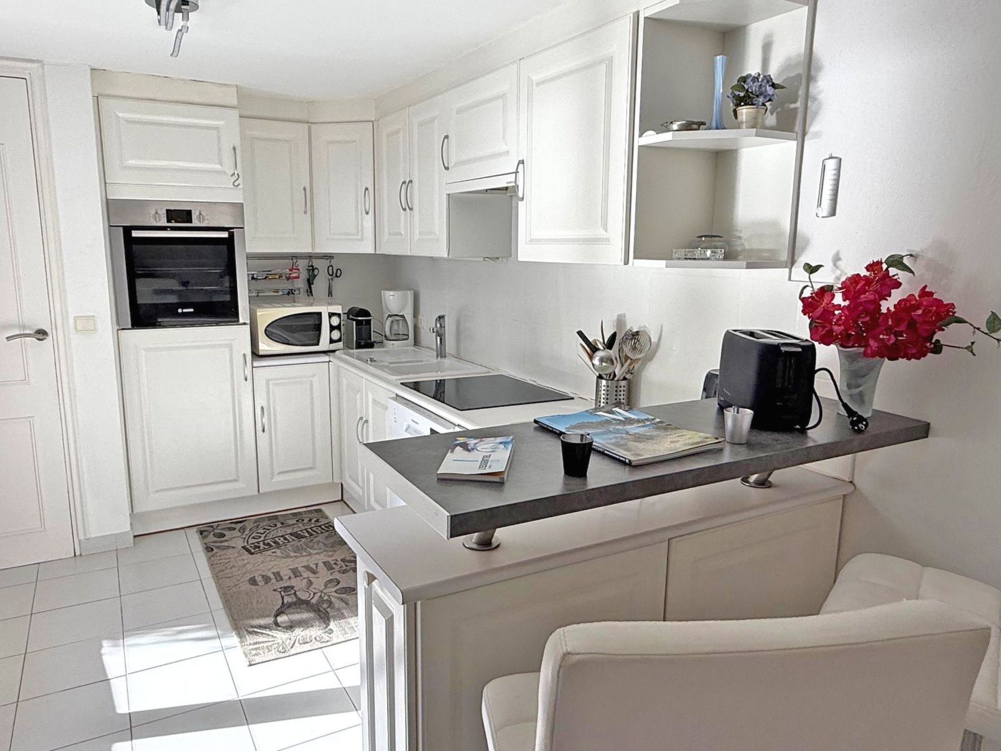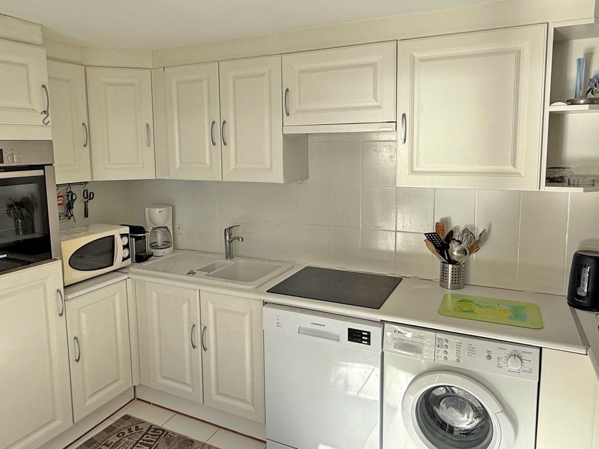 - Cuisine ouverte très bien équipée : réfrigérateur avec congélateur, lave-vaisselle, lave-linge, plaque de cuisson, four, micro-ondes, cafetière Nespresso, bouilloire, grille pain, vaisselles et ustensiles divers