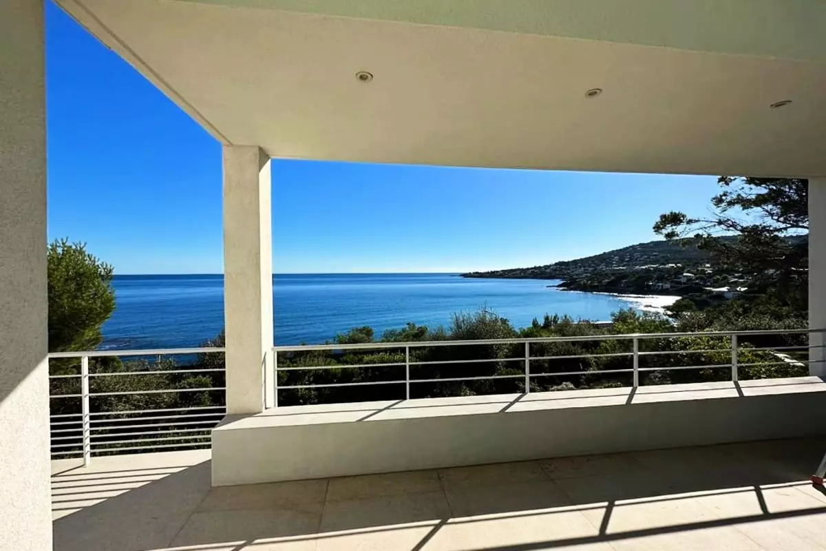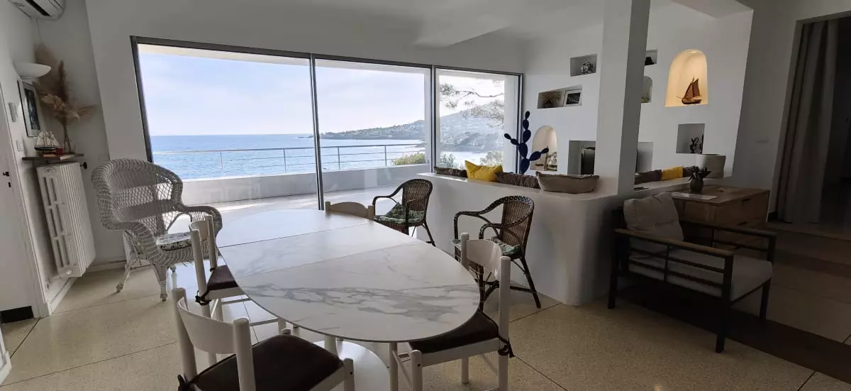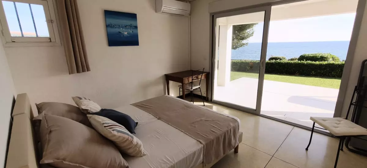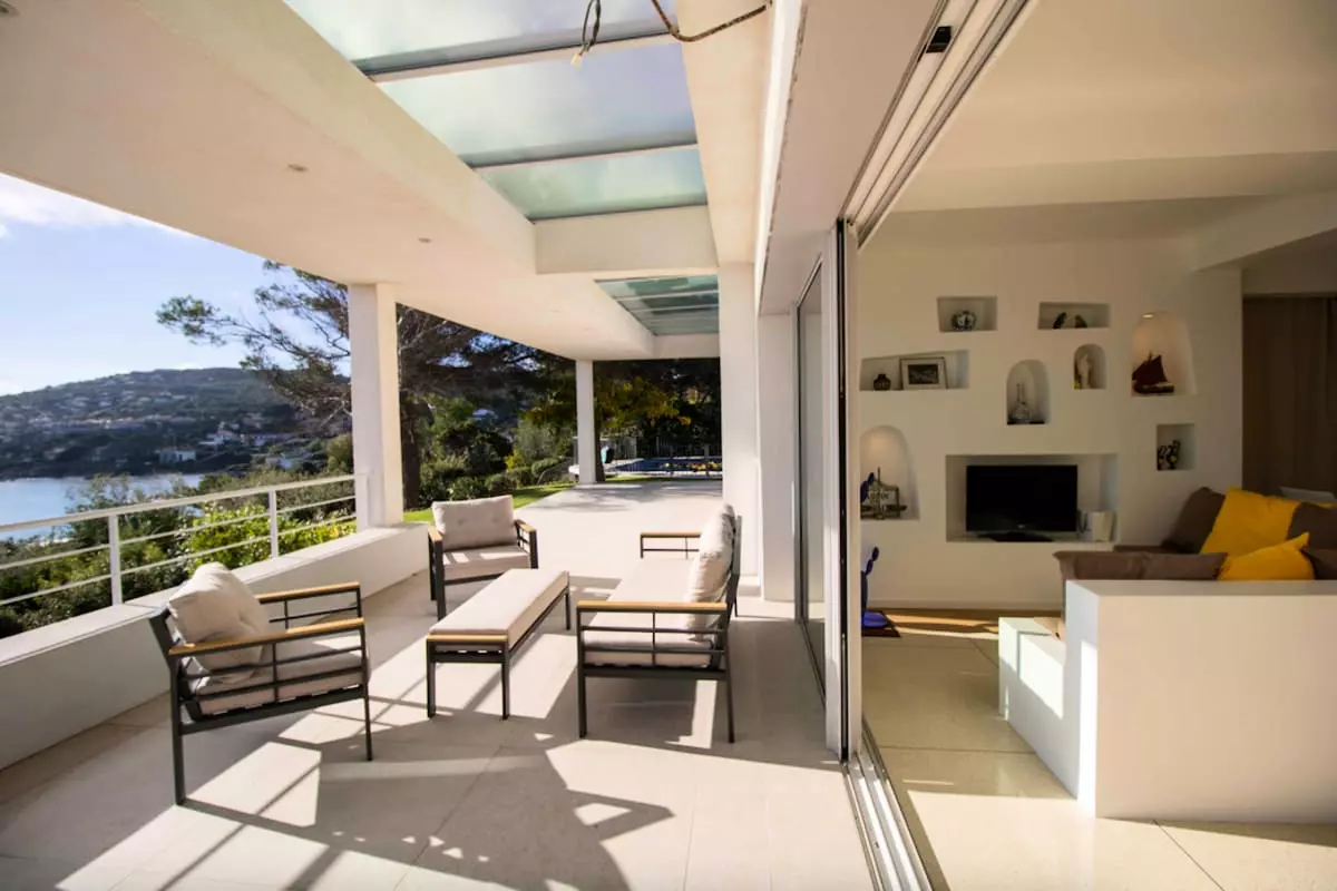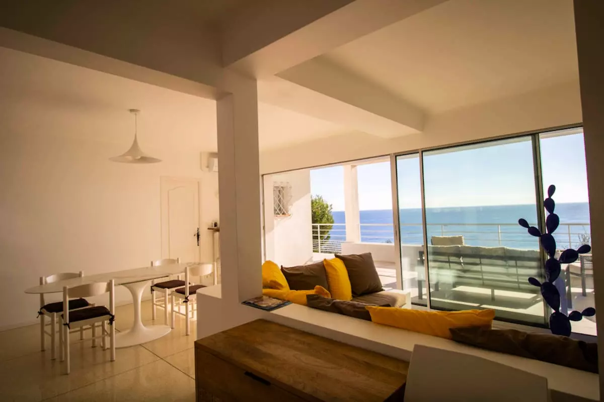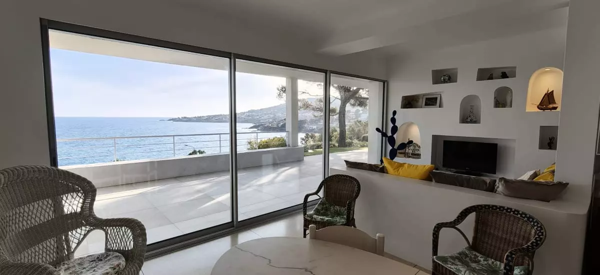 - un salon ouvrant sur terrasse, avec une baie coulissante de 5 mètres et une vue dégagée sur la mer ;