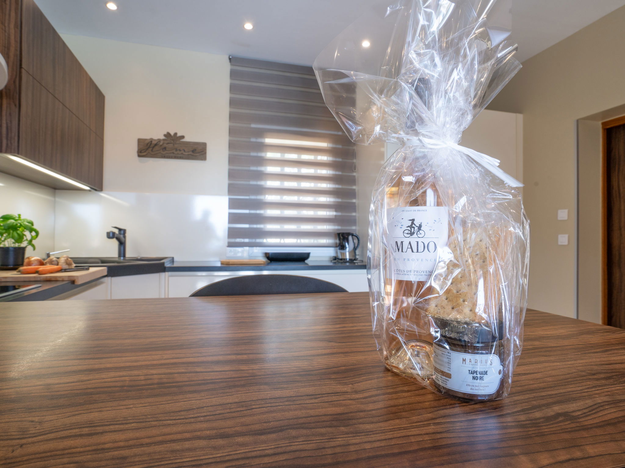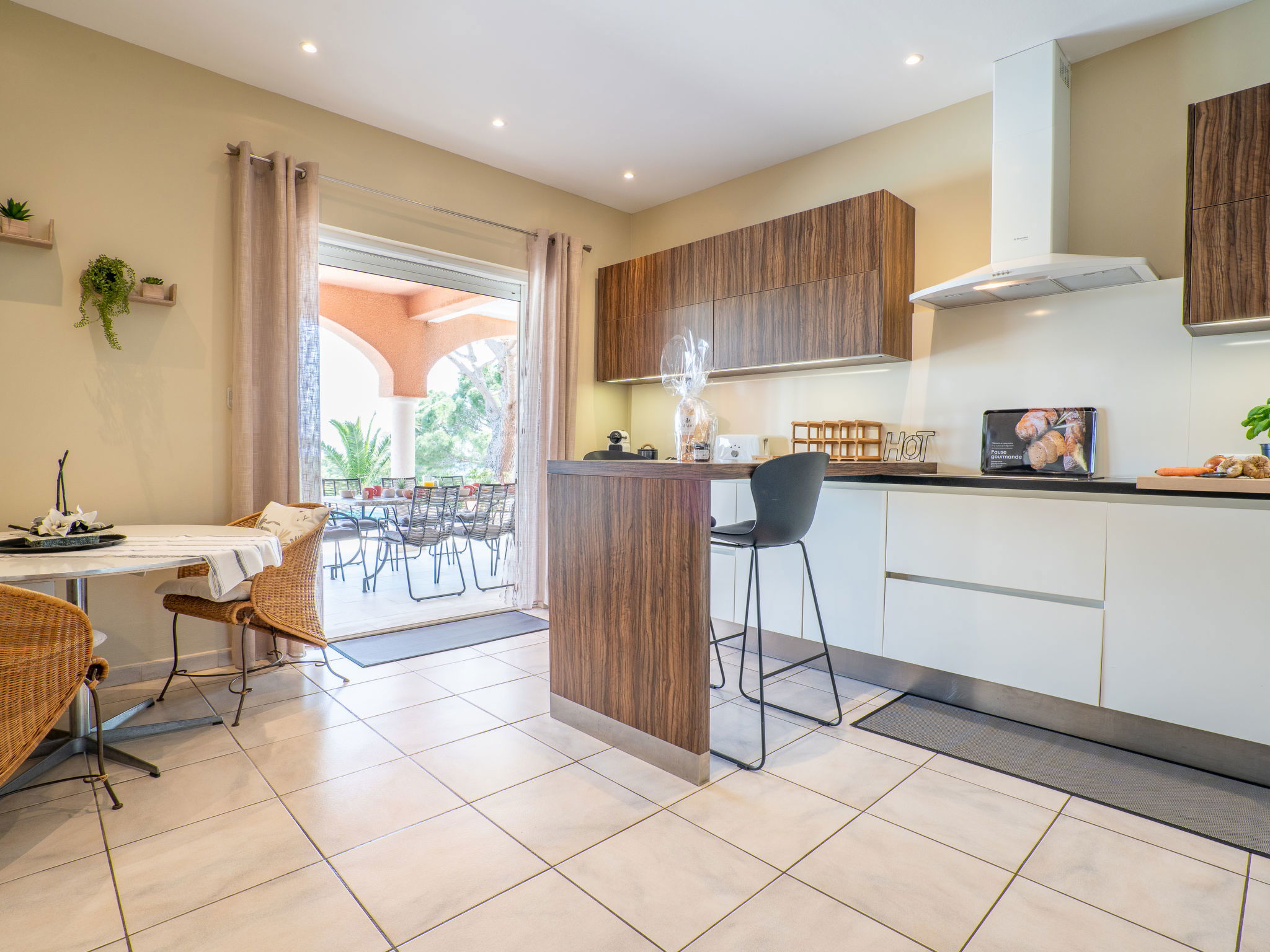 "Cacharel", maison 5 pièces 290 m2 sur 2 niveaux. Aménagement moderne et de bon goût: grand séjour/salle à manger avec TV (satellite) et chaîne stéréo. Sortie sur la terrasse. 1 chambre avec 1 grand-lit (180 cm). Sortie sur la terrasse. Cuisine (four, lave-vaisselle, 4 plaques vitrocéramiques, grille-pain, bouilloire électrique, micro-ondes, congélateur, cafetière électrique) avec petite table pour les repas. Sortie sur la terrasse. WC séparé. À l'étage supérieur: 2 chambres, chaque chambre avec: 1 grand-lit (180 cm). Sortie sur le balcon. 1 chambre avec 2 lits. Sortie sur le balcon. Bain/douche, douche/WC, WC séparé, double vasque. Chauffage, air-conditionné. Sol en parquet. Grande terrasse partiellement couverte, situation est, petite terrasse, situation ouest. Meubles de terrasse, barbecue électrique, chaises longues. Vue sur la mer. A disposition: lave-linge, fer à repasser, lit bébé. Internet (Connexion WIFI, gratuit). Veuillez noter: maison non-fumeur. Détecteur de fumée. 83115001180SX