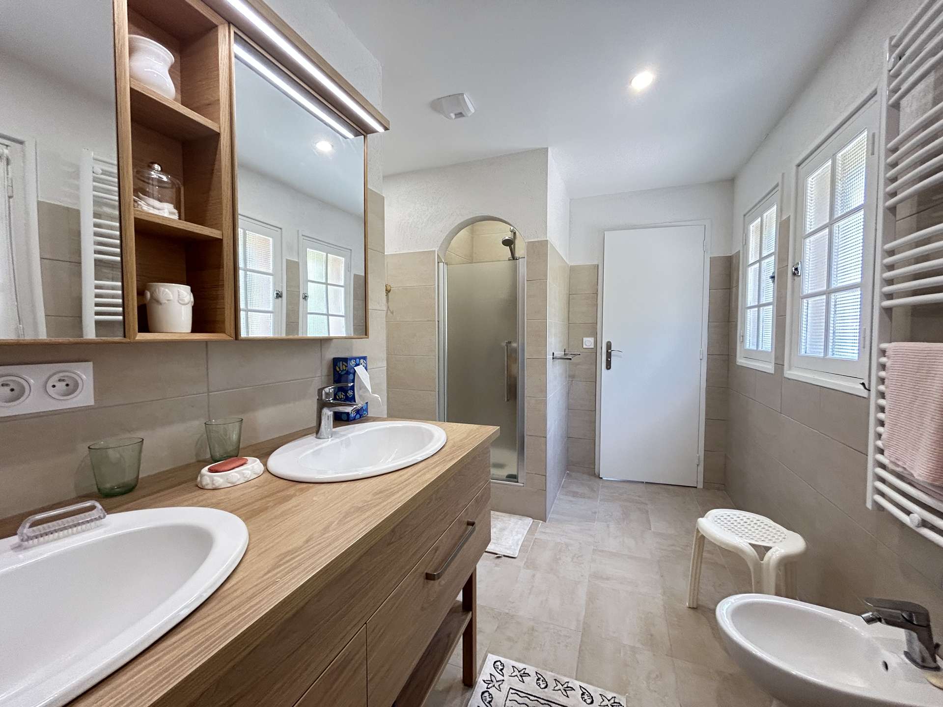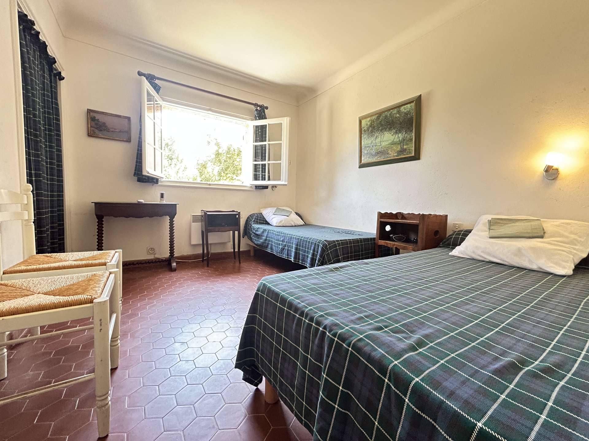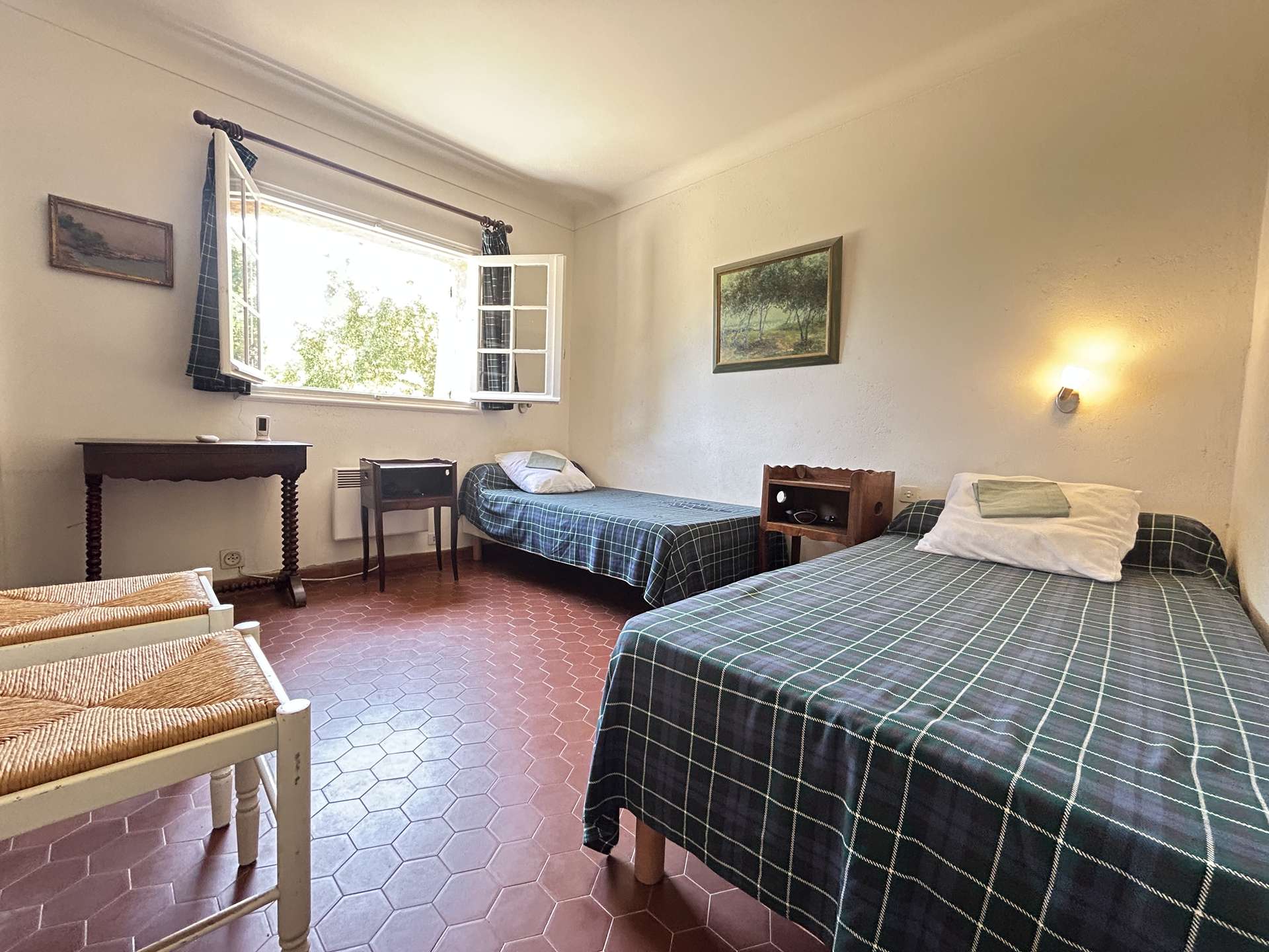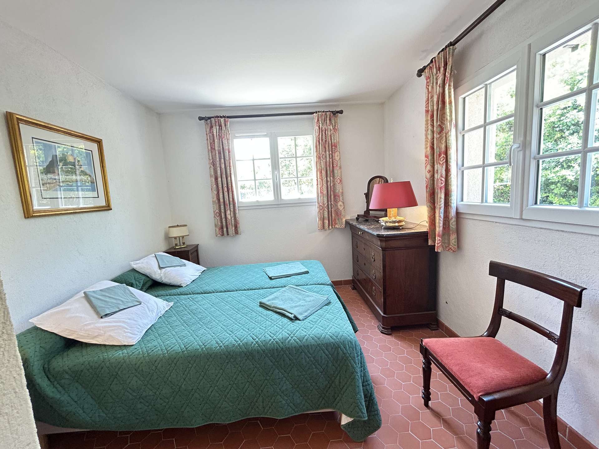 Meublée avec goût et ouverte sur l’extérieur, elle comprend, une entrée, un beau séjour lumineux avec une vraie cuisine équipée, vous disposerez d'une suite parentale avec salle d’eau et deux grandes chambres avec des lits jumeaux. WC indépendant. Les deux terrasses orientées Sud vous permettont de profiter d'un espace détente et déjeunatoire, elles sont couvertes et protégées du soleil.